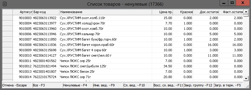 NB: После ввода остатков формируется сличительная ведомость для анализа данных. В это ведомости видны, количество и сумма, продаж по-красному, излишков и недостач.