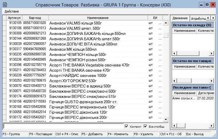 Окно состоит из двух частей. Левая часть предназначена для ввода и отображения основных данных о товаре, а правая часть служит для отображения подробных данных о том, в какую группу и разбивку входит товар, об остатках товара по поставщикам и складам, о дополнительных бар-кодах на этот товар, а так же о последних поставках этого товара.