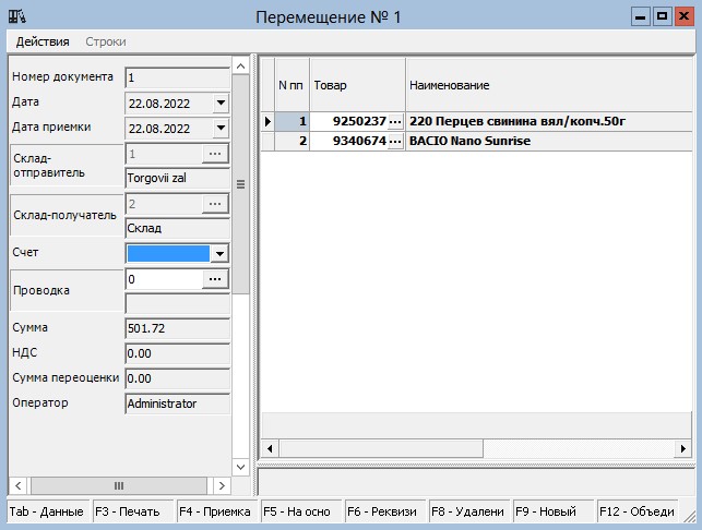 Окно состоит из двух частей. Левая часть предназначена для просмотра и редактирования данных о документе, а правая часть служит для просмотра и редактирования данных о товарах, которые будут перемещены.