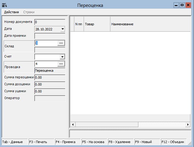 Окно состоит из двух частей. Левая часть предназначена для просмотра и редактирования данных о документе, а правая часть служит для просмотра и редактирования данных о товарах, которые будут переоценены.