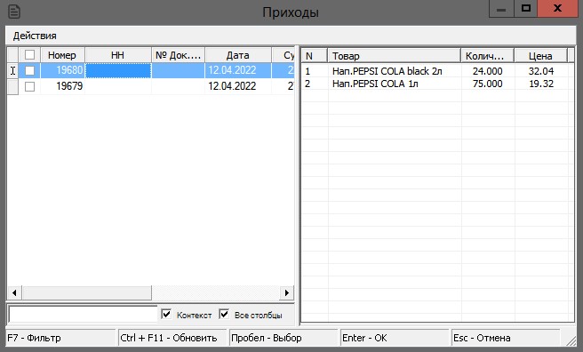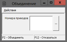 Это окно закроется. В окне выбора документов для объединения, будут показаны номера приходных документов.