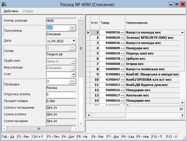 Пункт подменю "Расход" из меню "Документы" вызывает окно, которое предназначено для выполнения следующих операций: