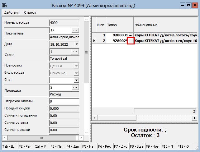 В правую часть окна будет добавлена новая строка. Каждая строка представляет собой запись одного вида товара. Чтобы добавить данные об отпущенном товаре, следует нажать на кнопку, которая находится возле названия товара. На рисунке эта кнопка выделена красным.