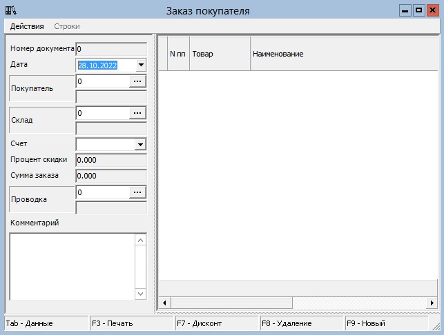Пример окна "Заказ от покупателя" показан на рисунке приведенном ниже. Это вид окна сразу после его открытия.