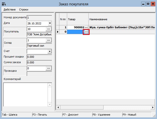 В поле "Покупатель" либо введите код заказчика, либо нажмите на кнопку